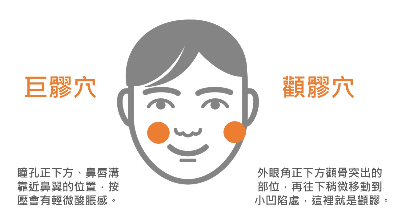 顴髎穴:摸到外眼角正下方顴骨突出的部位,再往下稍微移動到小凹陷處。