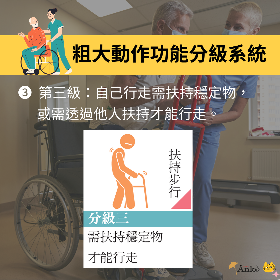 第三級:自己行走需扶持穩定物,或需透過他人扶持才能行走