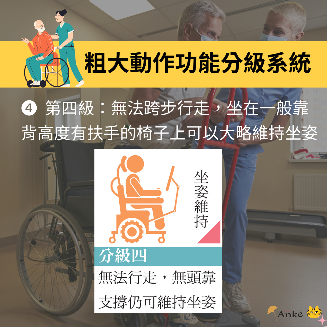 第四級:無法跨步行走,坐在一般靠背高度有扶手的椅子上可以大略維持坐姿