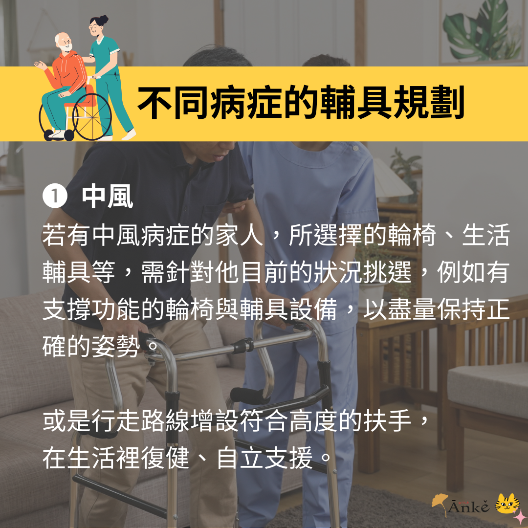 若有中風病症的家人,所選擇的輪椅、生活輔具等,需針對他目前的狀況挑選,例如有支撐功能的輪椅與輔具設備,以盡量保持正確的姿勢;或是行走路線增設符合高度的扶手,在生活裡復健、自立支援。