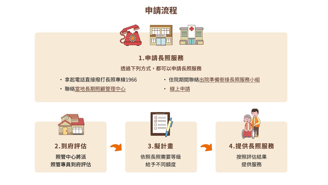 衛福部設有長期照顧服務官網,官網指出,65歲以上老人、55歲以上原住民、50歲以上失智症者及失能身心障礙者,經各縣市長期照顧管理中心評估,符合長照需要等級2級以上者可使用長照服務,申請方式包括直接撥打長照專線1966、線上申請、聯絡當地長期照顧管理中心及住院期間聯絡出院準備銜接長照服務小組。