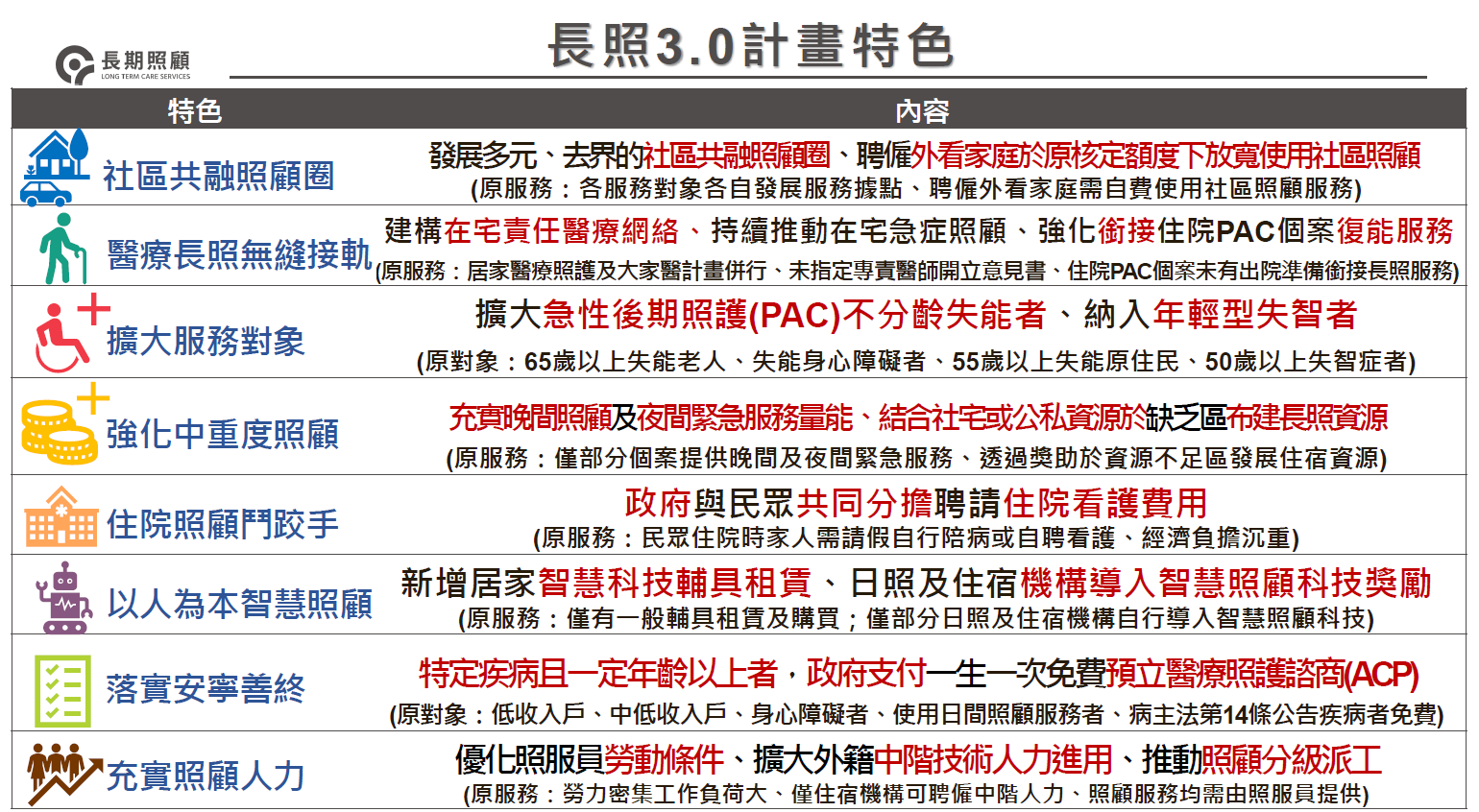 聘請外籍看護照顧家人的家庭,今年9月1日起可使用日照與家庭托顧服務,預計2026年1月1日起施行長照3.0擴大長照給付對象,針對年輕型失智症者及急性後期整合照護計畫PAC對象提供更適切的照顧支持。衛福部長照司吳希文副司長表示,之前有提放寬中風者不限年齡納入長照,這次修法擴大對象含PAC,PAC適用對象其中就包括中風者,只要PAC對象在出院後經評估仍失能就可使用長照3.0服務。