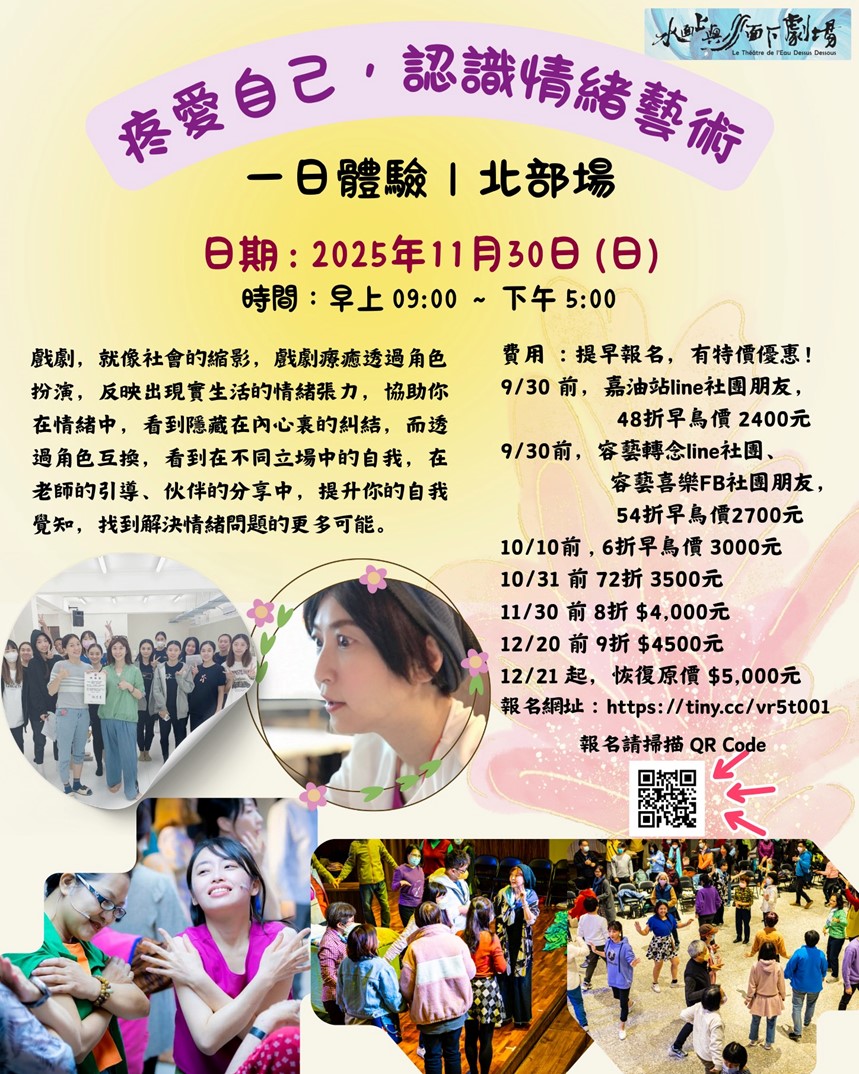 🔹疼愛自己,認識情緒藝術 北部一日體驗場 日期:2025/11/30(日)09:00–17:00 https://forms.gle/Y5DmW4jzrMGhFBP3A