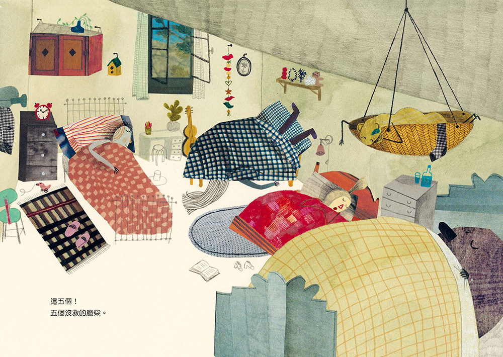 很難想像讀繪本可以讀到眼角濕濕,常常在很多繪本中看到過去與現在的自己,碧翠絲‧阿雷馬娜《5個廢柴》便是讓我感動不已的作品之一,多年前,日本青年就掀起了一陣廢柴思維,重新定義人生價值並提出調整消費欲望後,原來工作可以不再是為了生存,而是實踐生活,這個世代變化太快,無關乎對錯,也正提醒我們可以有更多元的角度看待自己及他人。