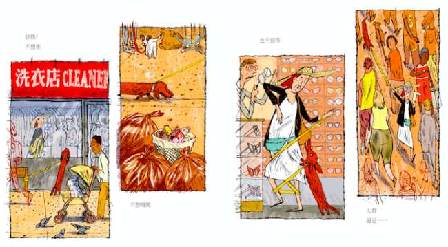 整本書很難單用文字說明的方式寫出圖像中主角的心情感受,因為書中小狗及女士的心情充分以圖畫呈現,不論是天氣,人擠人的街道,或是混凝土的碎裂聲、又或是刺耳的嗚笛與喇叭聲,都令人感到窒息,也讓人對原本喜愛的事和興趣提不起任何勁。圖像上城市壓迫、密集、破碎的視覺節奏斜線、擁擠的建築、擠滿的腳,大量用了橘、紅暖色系佔滿整頁,這些畫面讓「熱」具象化,也讓壓力有了形狀。