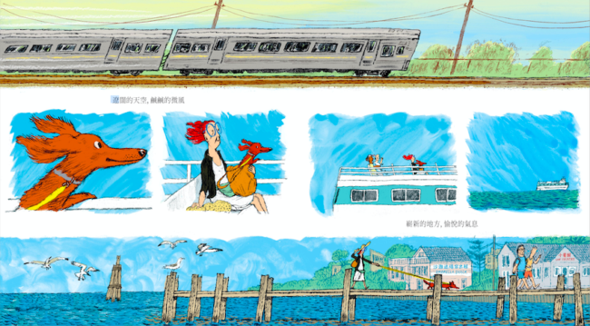 故事發展到最後,當然就是要離開這令人煩躁的城市……隨著圖像,我們也一起放鬆……,水藍成為主色,線條變得柔軟,動作也變得奔放,直到夕陽西下,女士帶著狗狗回家,明明和早上是一樣的道路、一樣的人擠人和一樣熟悉的氣味,但心境上卻大大不同了,讀者的情緒也從壓迫到展開,呼吸從短促漸漸緩慢深層,心也從混亂變得安穩。